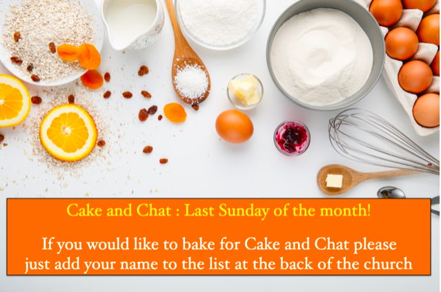 The Cake and Chat List for 2026 is now at the back of the church. Please add your name to the list for the month you would like to do