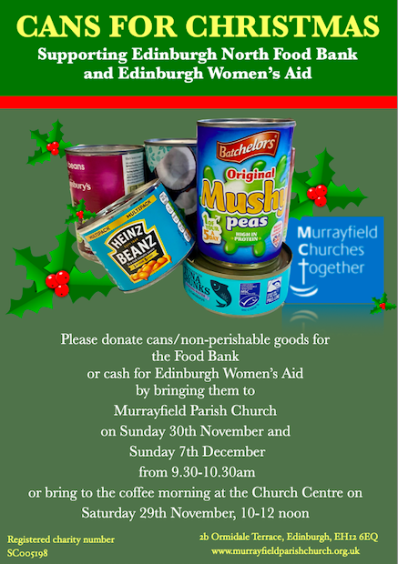 We will once again be collecting canned good, dried goods and cash to be given to the Edinburgh Food Bank and Edinburgh Women’s Aid. Donations should be handed into the church on Sunday 30th November and Sunday 7th December between 9.30 and 10.30 am. They can also be brought to the Coffee Morning on Saturday 29th November between 10 am and 12 noon.