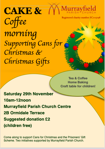 We are looking forward to our church/community coffee morning on Saturday 29th November, 10am-12noon in the church centre. We will be supporting our Christmas initiatives ‘Cans for Christmas' and ‘Gifts for Prisoners’ Children'. Please spread the word to friends and neighbours.